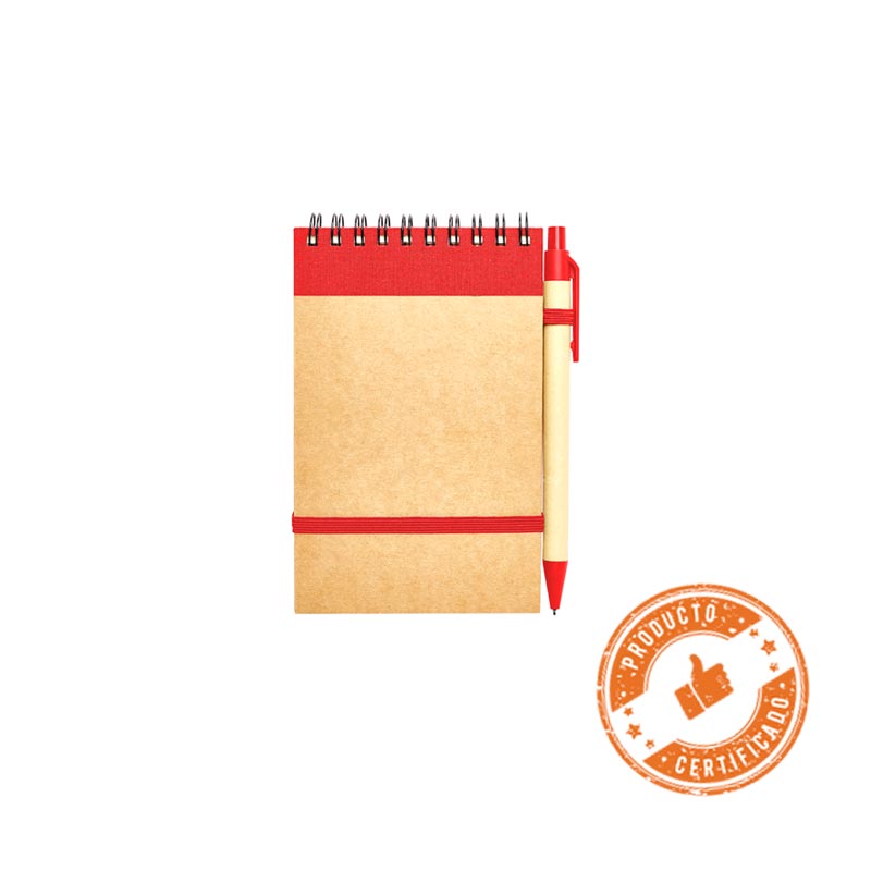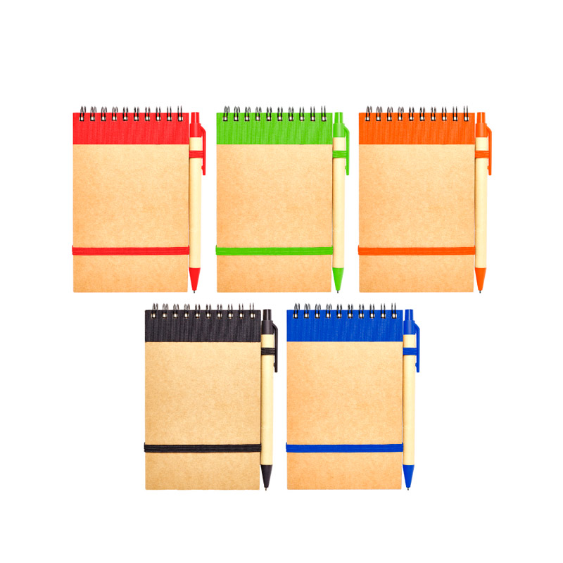 • Anotador con detalles en color. Cierre con banda elástica, porta bolígrafo con bolígrafo incluido y 50 hojas lisas recicladas.