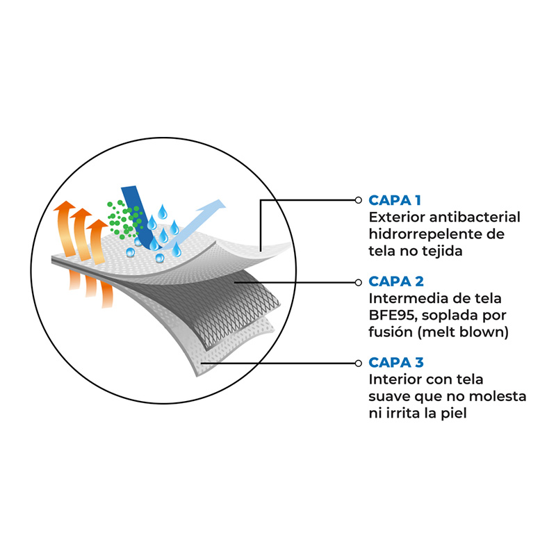 Volver a la tiendaPolipropileno y non woven. 17,5 x 9,5 cm. Mascarilla de 3 capas rectangular. Capa exterior antibacterial, hidrorepelente. Capa intermedia material melt blown y non woven. Capa interior cuenta con una suave tela que no molesta ni irrita a la piel. Sujeción con elástico, las cuales rodean las orejas y permite una cómoda postura. La clasificación de este producto FFP2, esto asegura la eficacia del barbijo.