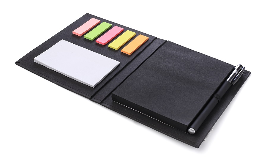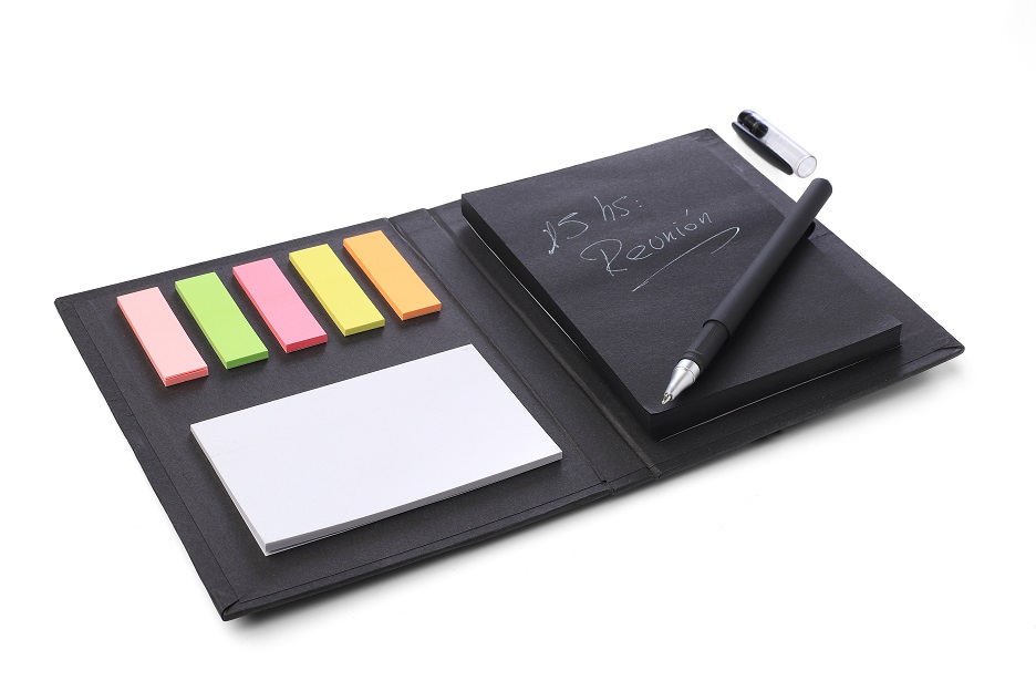 • Block autoadhesivo blanco de 25 hojas, señaladores post-its en 5 colores y block papel negro de 90 hojas