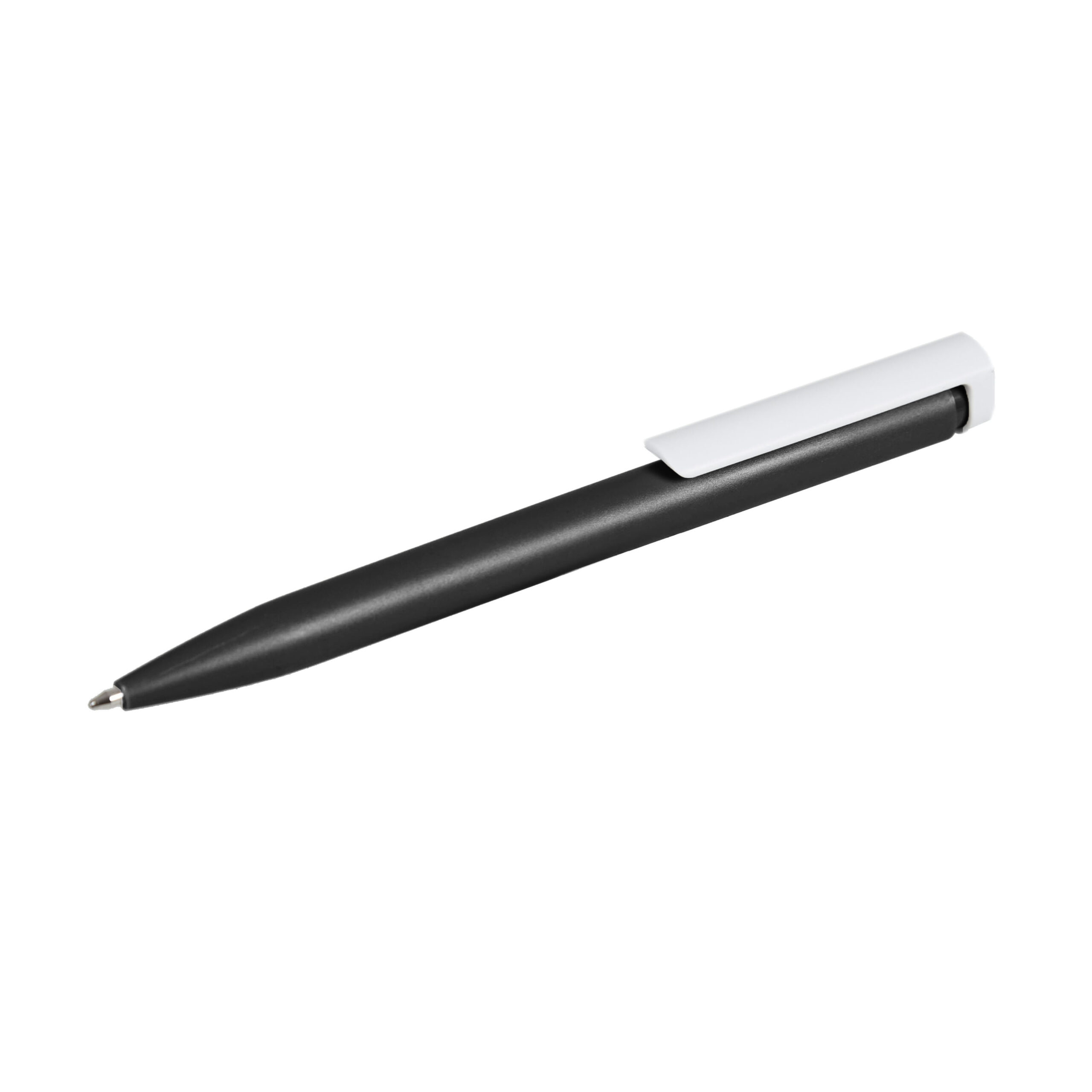 • Bolígrafo plástico de cuerpo de color sólido y clip en color blanco.