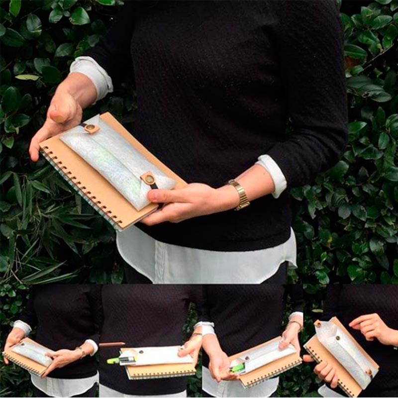 • Materiales: bolsas plásticas/ film de descarte procesado en una cooperativa + cuero curtido vegetal sin tratamiento químico.