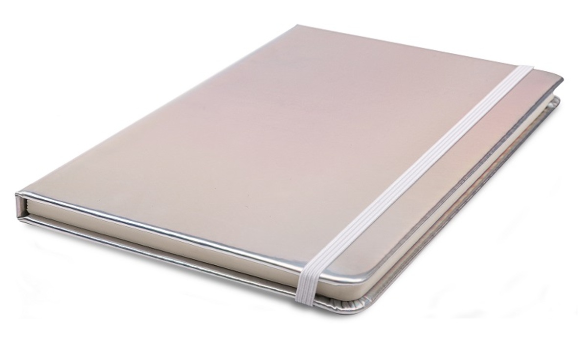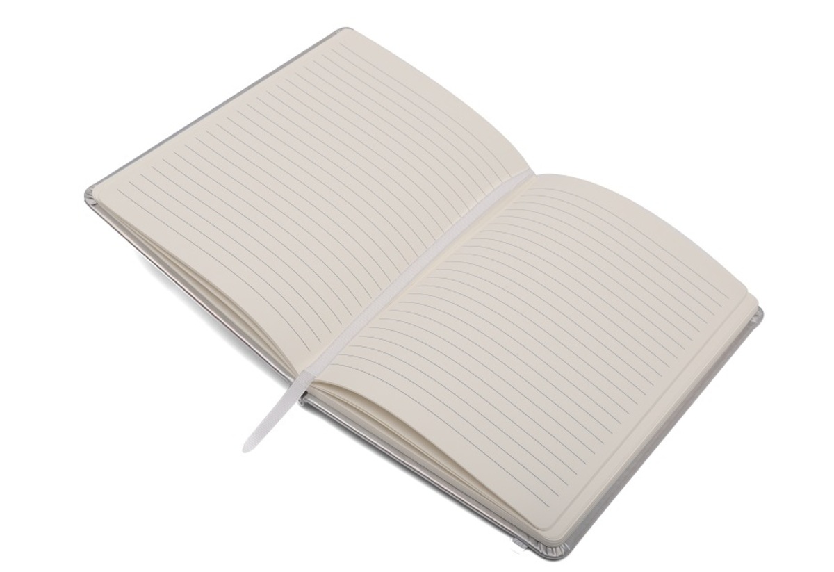 • Cuaderno tapa dura forrado en eco cuero brillante, con banda elástica de sujeción.