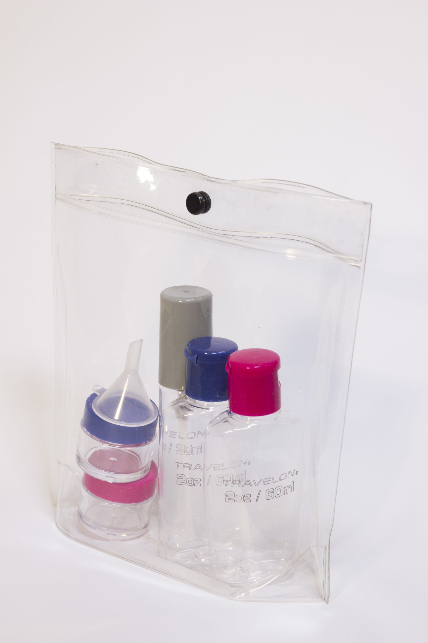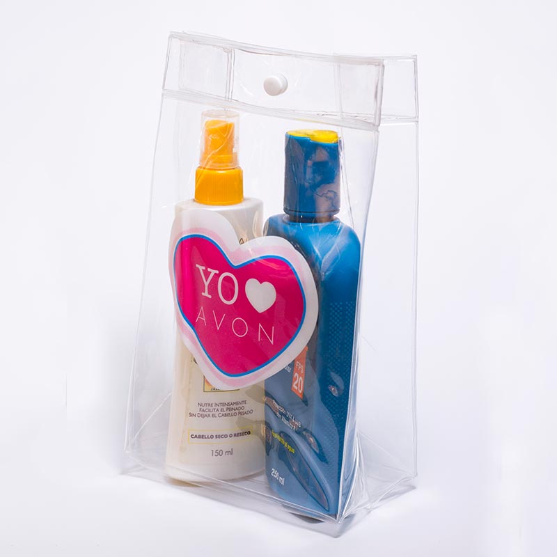 • Set en PVC cristal, refuerzo superior con broche plástico.