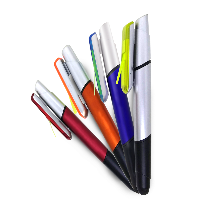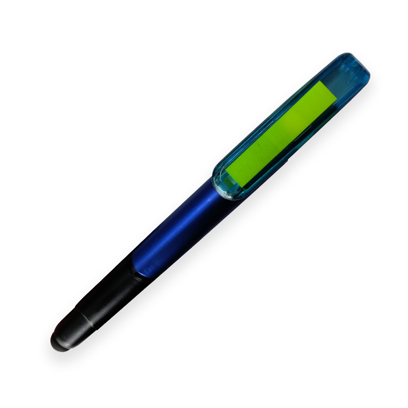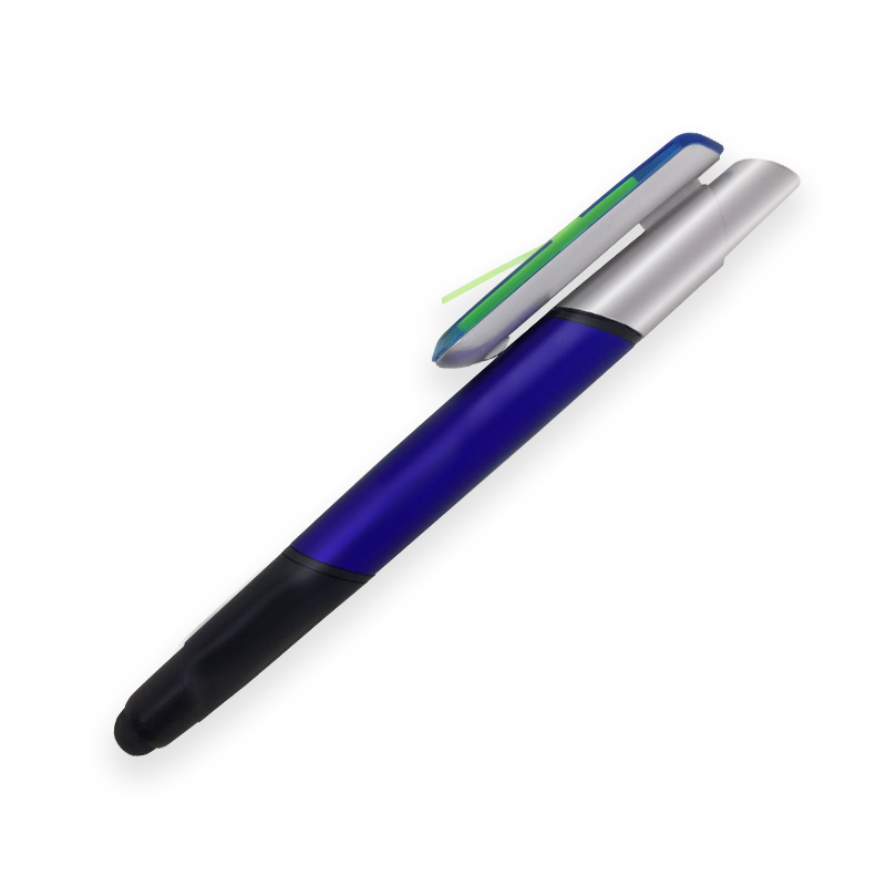 • Bolígrafo 3 en 1: tapa con puntera touch y resaltador con clip y dispenser de mini post it.