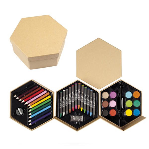Volver a la tiendaCartón. 16 x 8 cm. (cerrado) 44 x 8 cm. (abierto). Set de pinturas en forma de hexágono. 12 lápices de colores, 1 sacapuntas, 12 crayones, 1 goma de borrar, 12 acuarelas y 1 pincel.