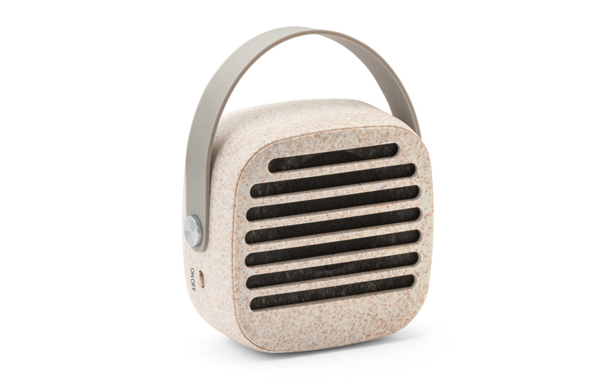 • Parlante portátil de fibra de paja de trigo y ABS con asa de silicona para facilitar su transporte.