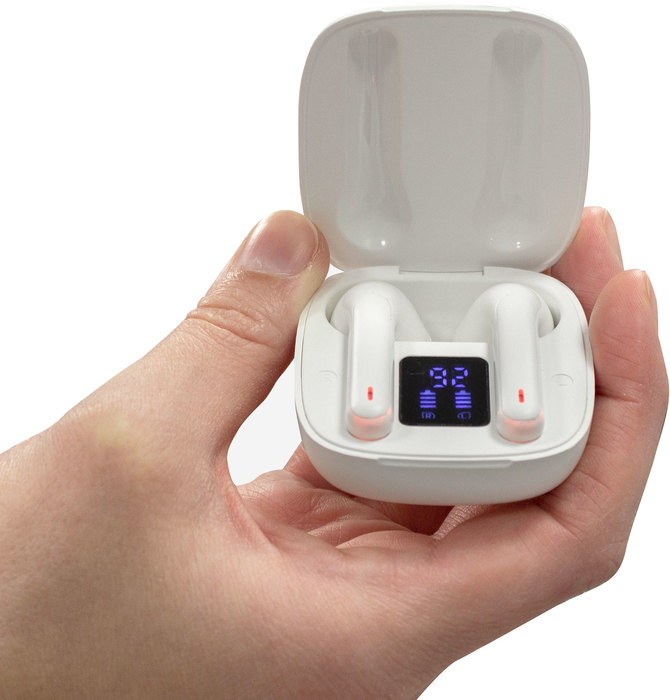 5,5 cm x 5 cm x 2,5 cm. (medida de la caja) 45 mm (auriculares). Plástico ABS. Auriculares bluetooth con imán, se conectan al celular de forma inalámbrica. Los auriculares cuentan con función touch en cada costado de los audifonos (izquierdo y derecho) para funciones de encendido, apagado, avance, retroceso, reproducción y pausar musica. Así como también para las funciones de responder, rechazar o finalizar una llamada. Estuche que permite cargar la batería de los auriculares. Indicador de batería del estuche. Base de carga 300 MAH . Auriculares: 30mAh Bluetooth V5.0. Rango de alcance 10 metros. Tiempo de reproduccion autónomo 3 horas aprox. Tiempo de carga de la batería 1 hora. Cable de carga USB tipo C. Duración de la batería en modo stand by: 40 hs.