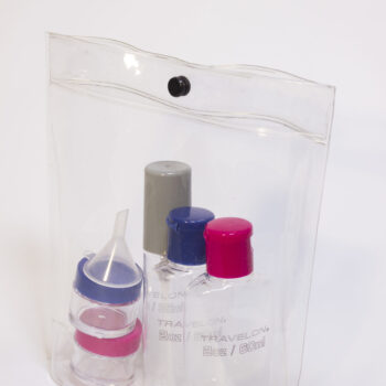 • Set en PVC cristal, refuerzo superior con broche plástico.