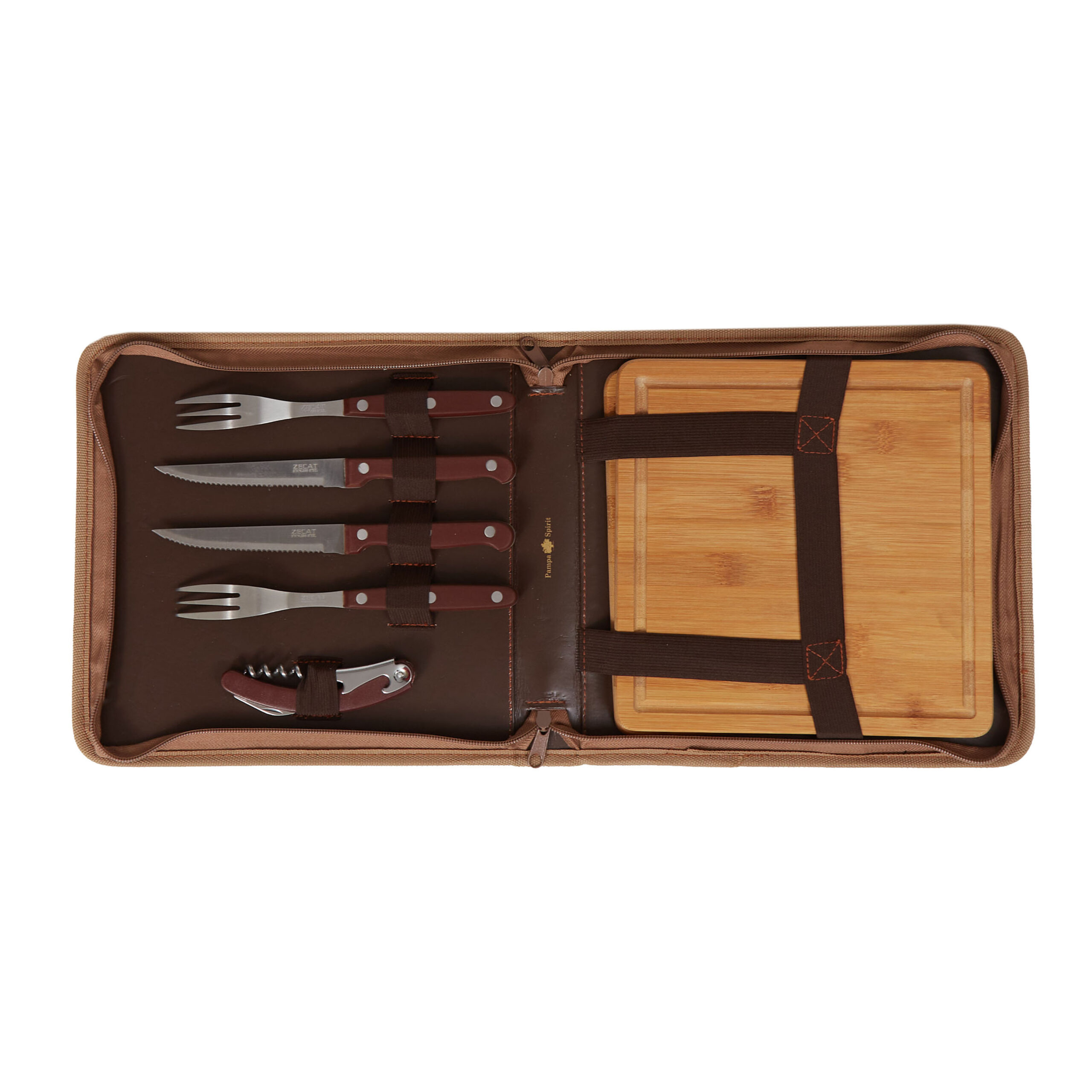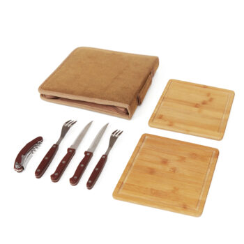 • Set de asado para dos personas con funda simil carpincho con cierre perimetral.