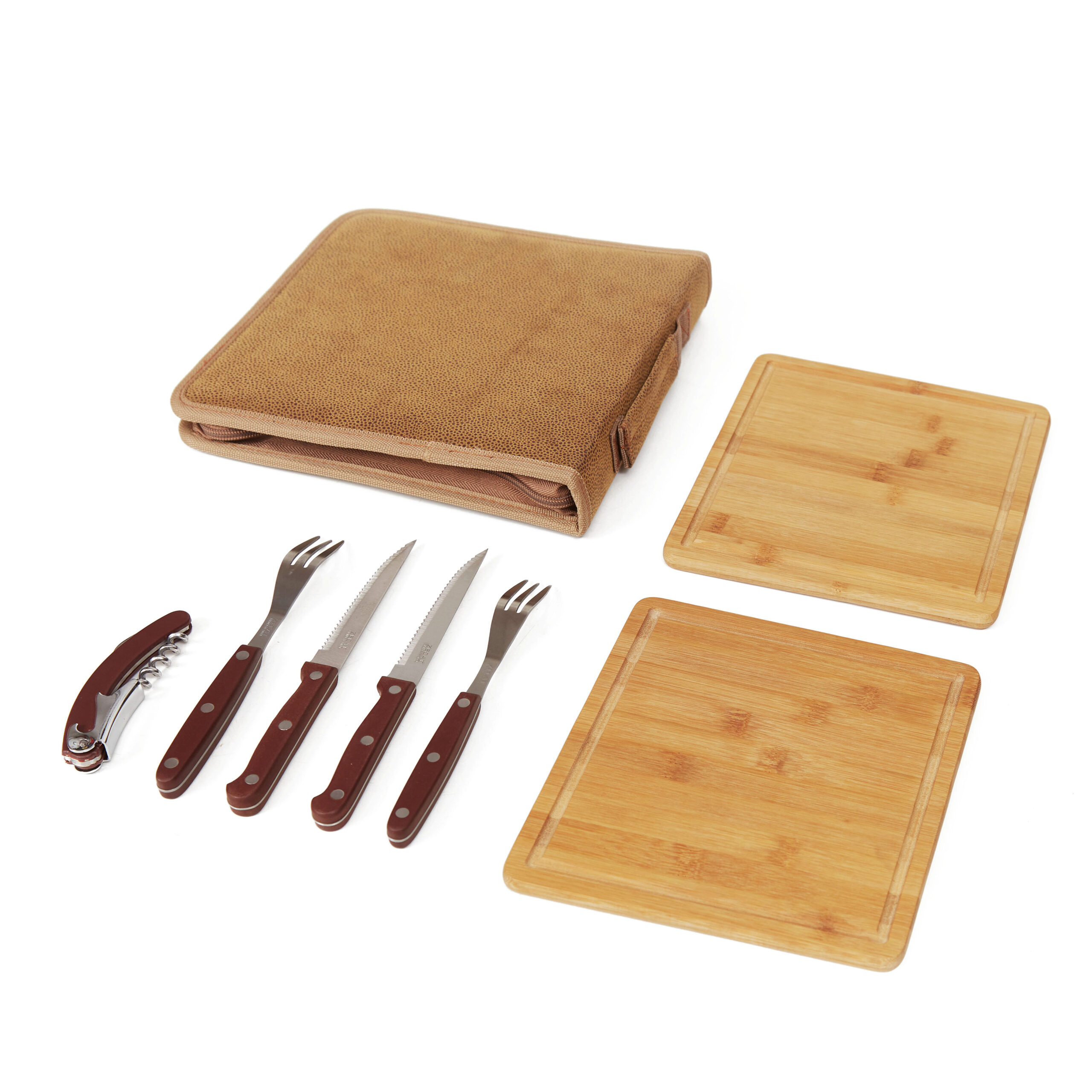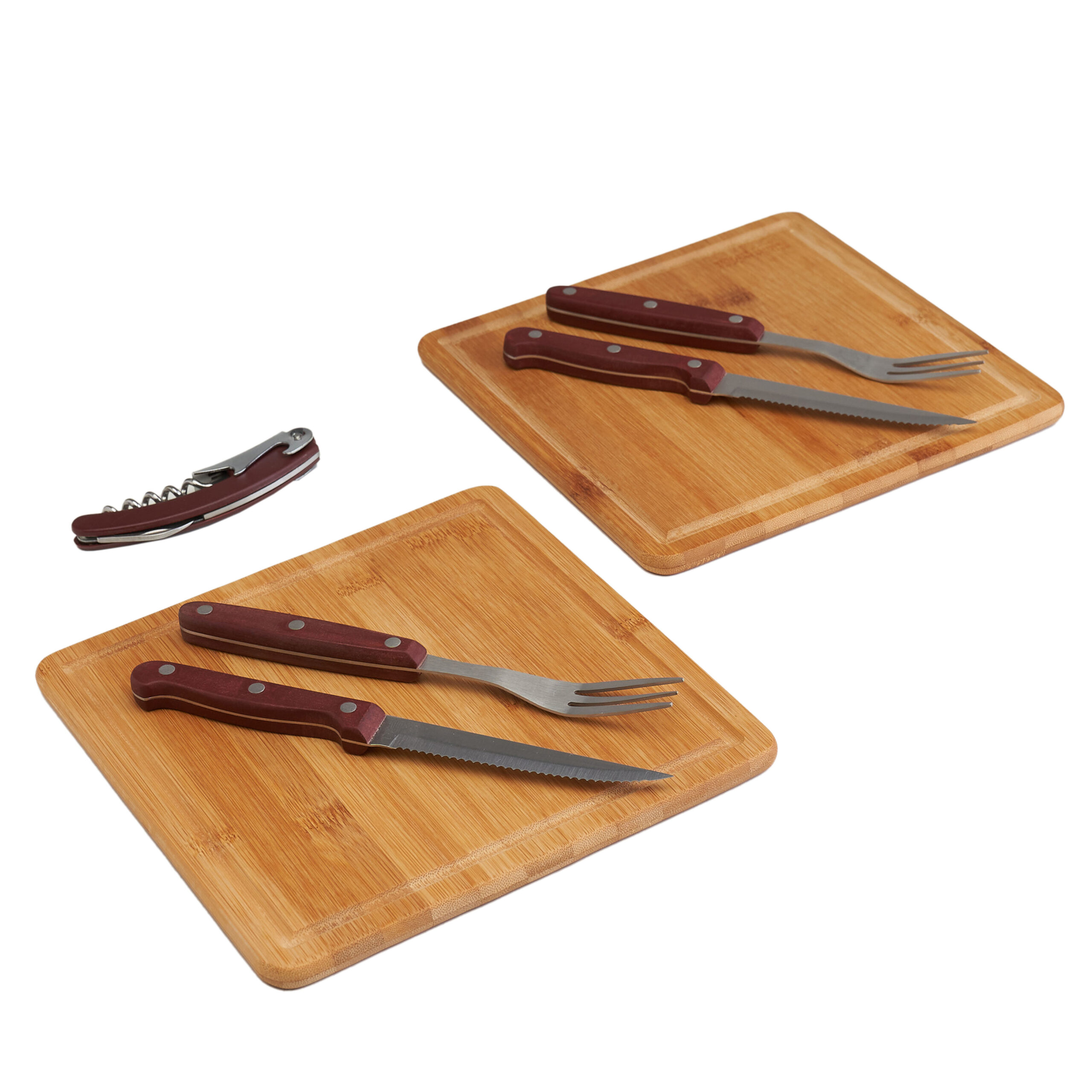 • Incluye 2 platos cuadrados de madera de bamboo, 2 juegos de cuchillo asador y tenedor de tres puntas de acero inoxidable y mango de bakelite marrón.