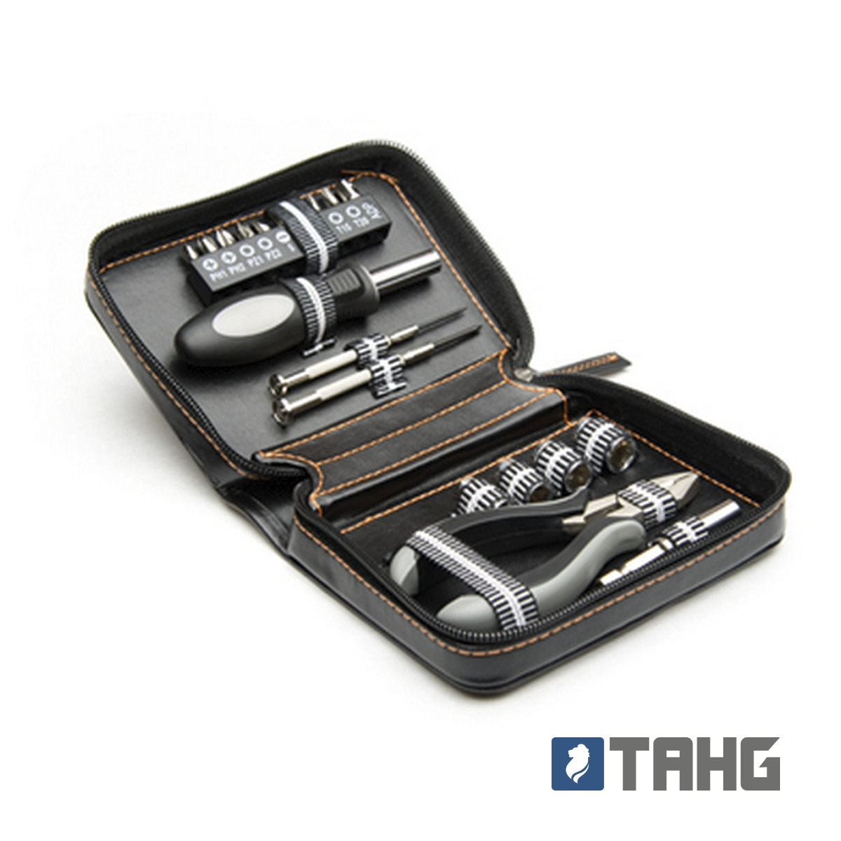 • Práctico estuche contenedor de cuero ecológico con cierre, zipper haciendo juego. Incluye: destornillador (plano y phillips), destornillador imantado de 9 puntas intercambiables, pinza para tomar pequeños objetos, adaptador, alargue, 4 tubos.
